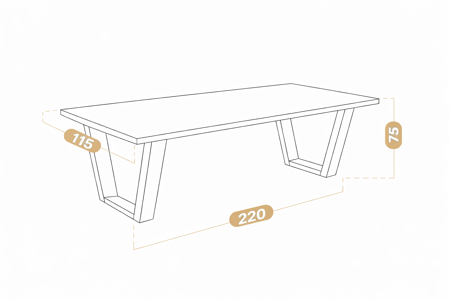 Las patas en forma de trapezoide aportan estabilidad y resistencia, sumando un contraste moderno que equilibra lo rústico y lo contemporáneo. Versátil y funcional, es ideal como mesa de comedor, mesa de centro o superficie de trabajo.